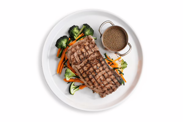Cchargrilled grass-fed rump steak served with a rich and creamy peppercorn sauce, accompanied by a variety of fresh seasonal vegetables.