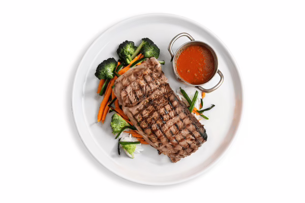 Chargrilled grass-fed rump steak topped with a flavorful Portuguese sauce, served with fluffy basmati rice and a selection of fresh seasonal vegetables.