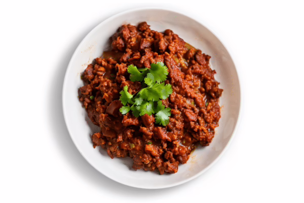 A hearty and spicy stew made with ground beef, tomatoes, beans, and chili peppers, infused with bold Tex-Mex flavors. Perfect served over rice or with tortilla chips for a satisfying meal.