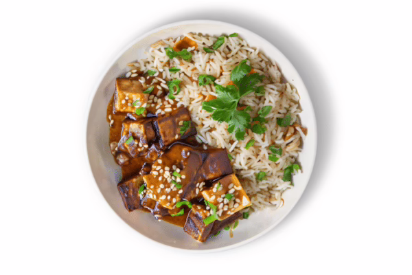 Tofu glazed with a honey soy BBQ sauce, served with stir-fried basmati rice