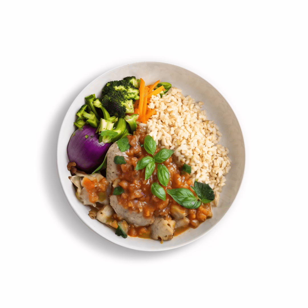 Enjoy slow-cooked chicken in a rich herb and tomato sauce, served with brown rice and vegetables