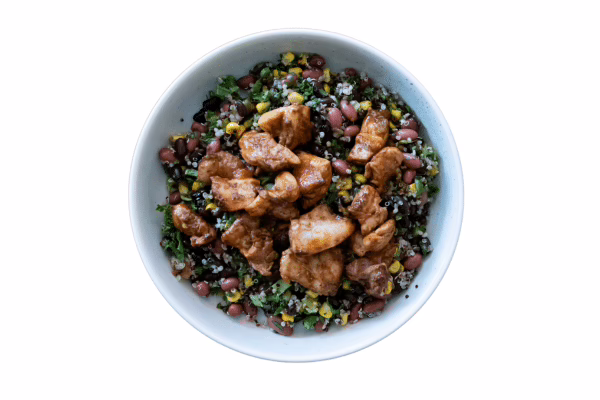 Ingredients: Chicken Thigh (60%) Red Kidney Beans (18%), White Quinoa (18%), Corn (15%), Turtle Beans (12%), Salsa Dressing (Sugar, Jalapeno (1.5%), Vinegar, Vegetable Oil, Honey, Coriander, Salt, Lime Juice Concentrate, Garlic, Thickener (Xanthan Gum)), Red Quinoa (8%), Kale, Capsicum, Onion, Coriander, Parsley, Peri Peri Seasoning (Olive Oil, Lemon Juice, Garlic, Ginger, Chilli Flakes, Paprika, Cayenne Pepper, Oregano, Black Pepper, Sea Salt).