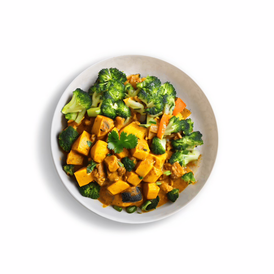 Tender chicken cooked in a creamy and mildly sweet mango curry sauce, served with a variety of fresh seasonal vegetables and basmati rice .
