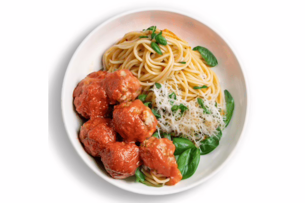 Savoury meatballs in rich Napoletana sauce atop gluten-free spaghetti for a classic Italian delight.