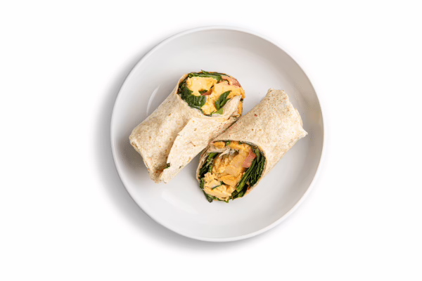 A soft egg wrap filled with fresh spinach and creamy feta cheese, offering a healthy and delicious meal.