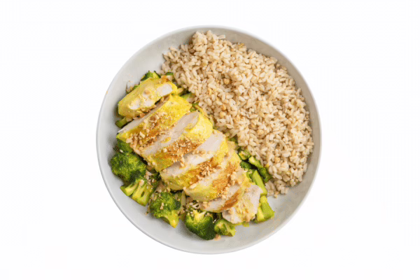Tender chicken breast marinated in a savory satay sauce and roasted to perfection. Served with wholesome brown rice and a colorful array of seasonal vegetables