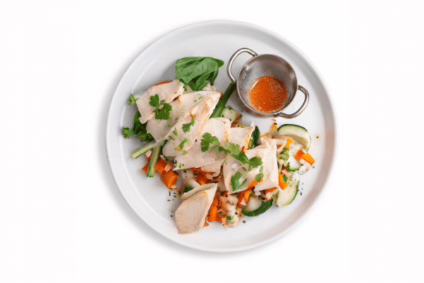 Chicken Breast (50%), Sweet Potato Mash (Sweet Potato, Water, Cream (Milk), Butter (Milk), Salt, Pepper White), Beans, Corn Cob, Capsicum Red, Carrot, Sweet Chilli Sauce [Thai Basil, Mint, Coriander, Sweet Chilli Sauce (Sugar, Garlic, Red Chilli, Acidity Regulator (260), Salt, Water, Thickener (1442, 415), Sweet Paprika, White Pepper], Lemon Wedge