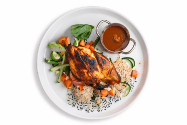 Spicy and flavour Peri Peri chicken breast served with brown rice and fresh vegetables .
