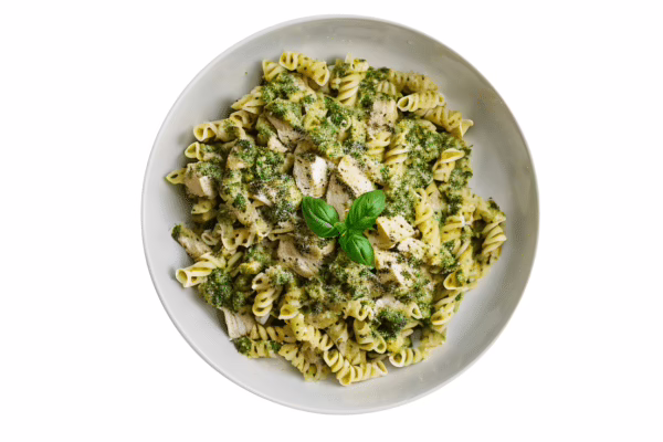 A delicious ready-to-serve salad made with spiral pasta, fresh vegetables, fragrant herbs, and slivered almonds in a flavourful pesto dressing, served alongside Mediterranean-spiced chicken breast.