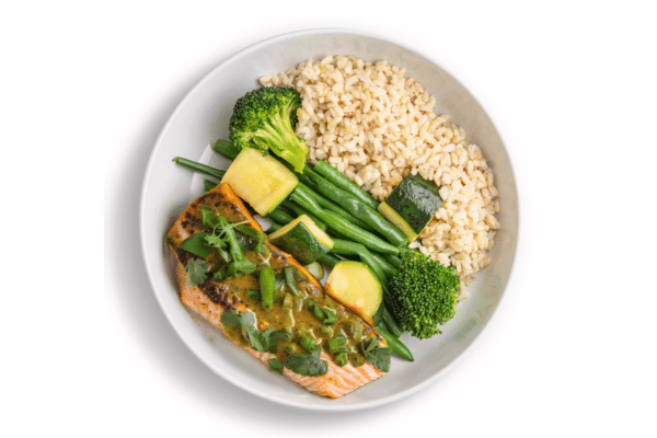 Sous vide salmon, Thai Green Curry , brown rice & Seasonal green beans- 350 g