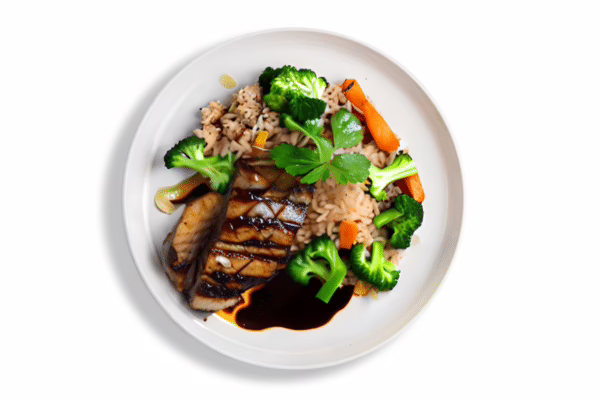 Sous vide barramundi, served with a special honey soy glaze and a lemon wedge, accompanied by brown rice and fresh vegetables.