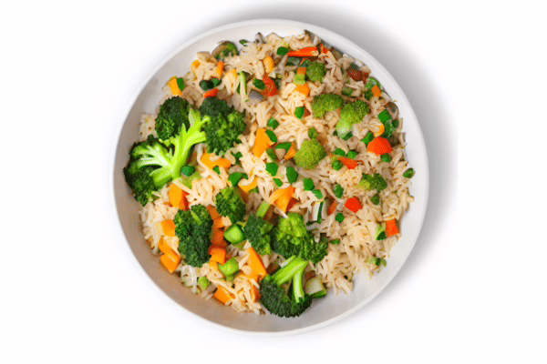 Brown Rice, Onion Red, soy sauce, Green Peas, Red Capsicum, Carrot, Corn, Spring Onion, Olive Oil