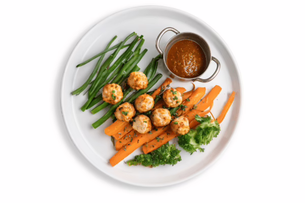 Juicy chicken meatballs seasoned with Thai spices, served with a sweet chili ginger sauce and a variety of fresh seasonal vegetables.