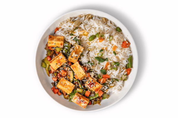 Flavorful tempeh cooked in a savory black bean sauce, served with stir-fried basmati rice.